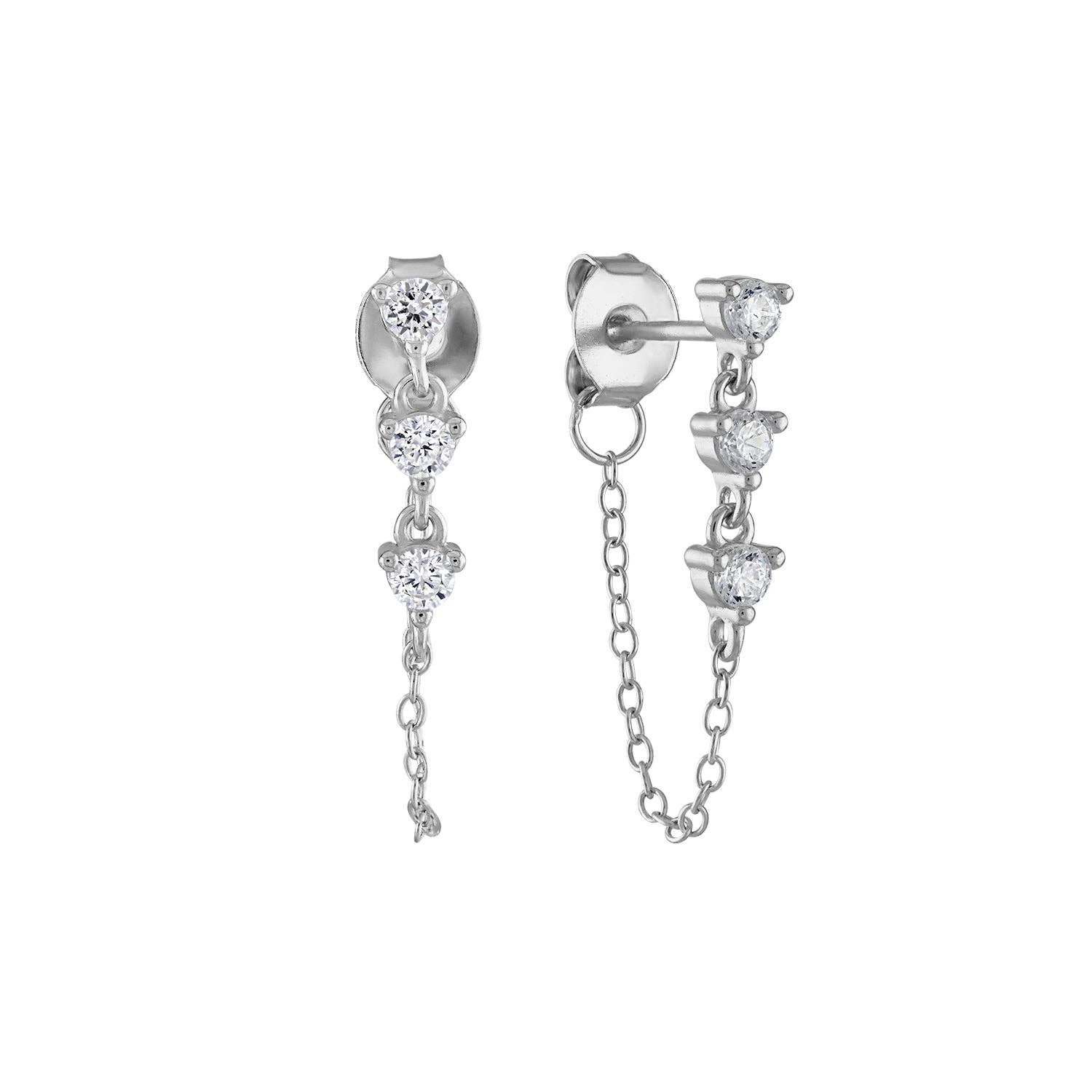 These Triple Prong-Set Dangle Chain Earrings bring a modern twist to everyday sparkle. Featuring three prong-set cubic zirconia stones suspended from a fine gold chain, they add soft movement and refined shine to your look.
