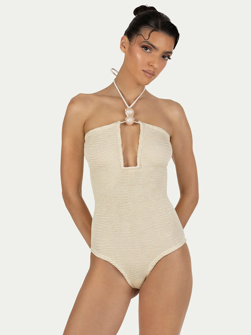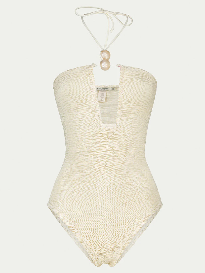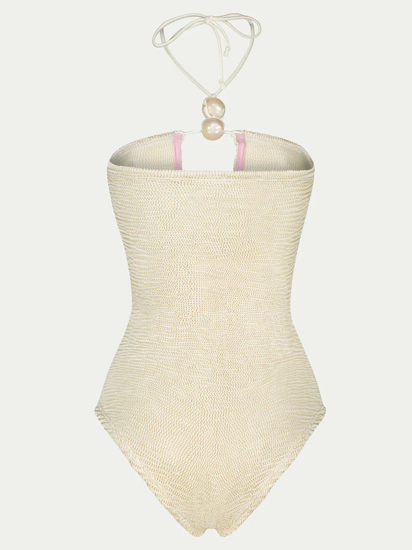 Elegant one-piece swimsuit in ivory with pearl-colored decorative accessories.
