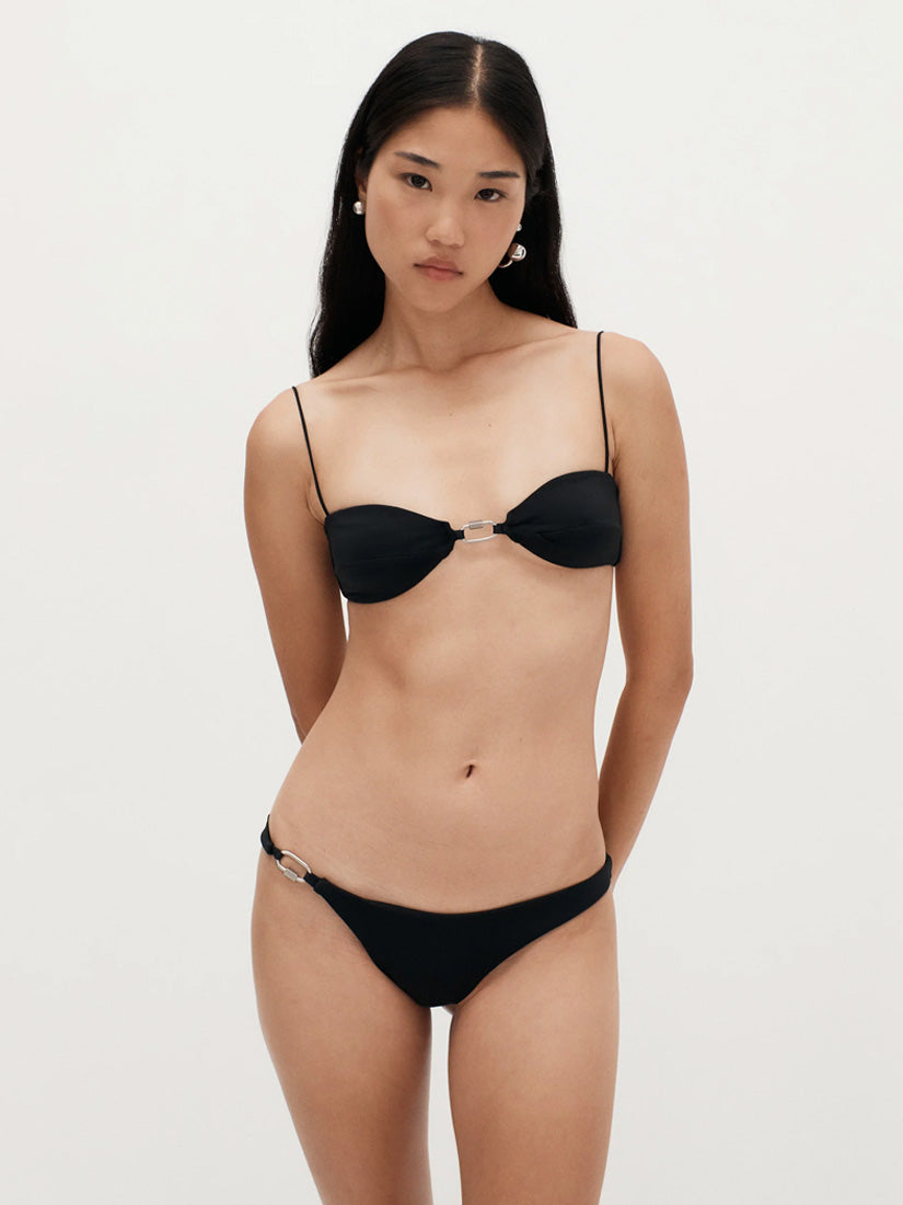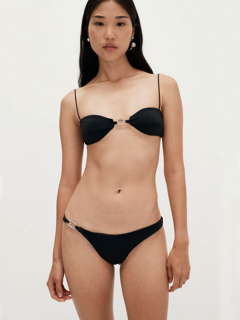 Bandeau bikini top with delicate straps, featuring a central hardware detail. Adjustable back and elastic straps for a custom fit.
