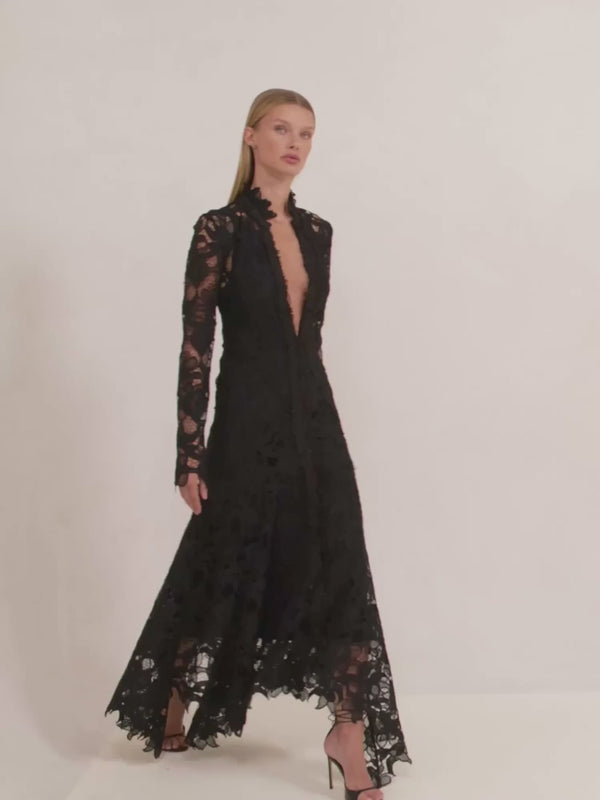 The Camila Dress is a long sleeve midi silhouette crafted in floral lace, featuring a plunging neckline.