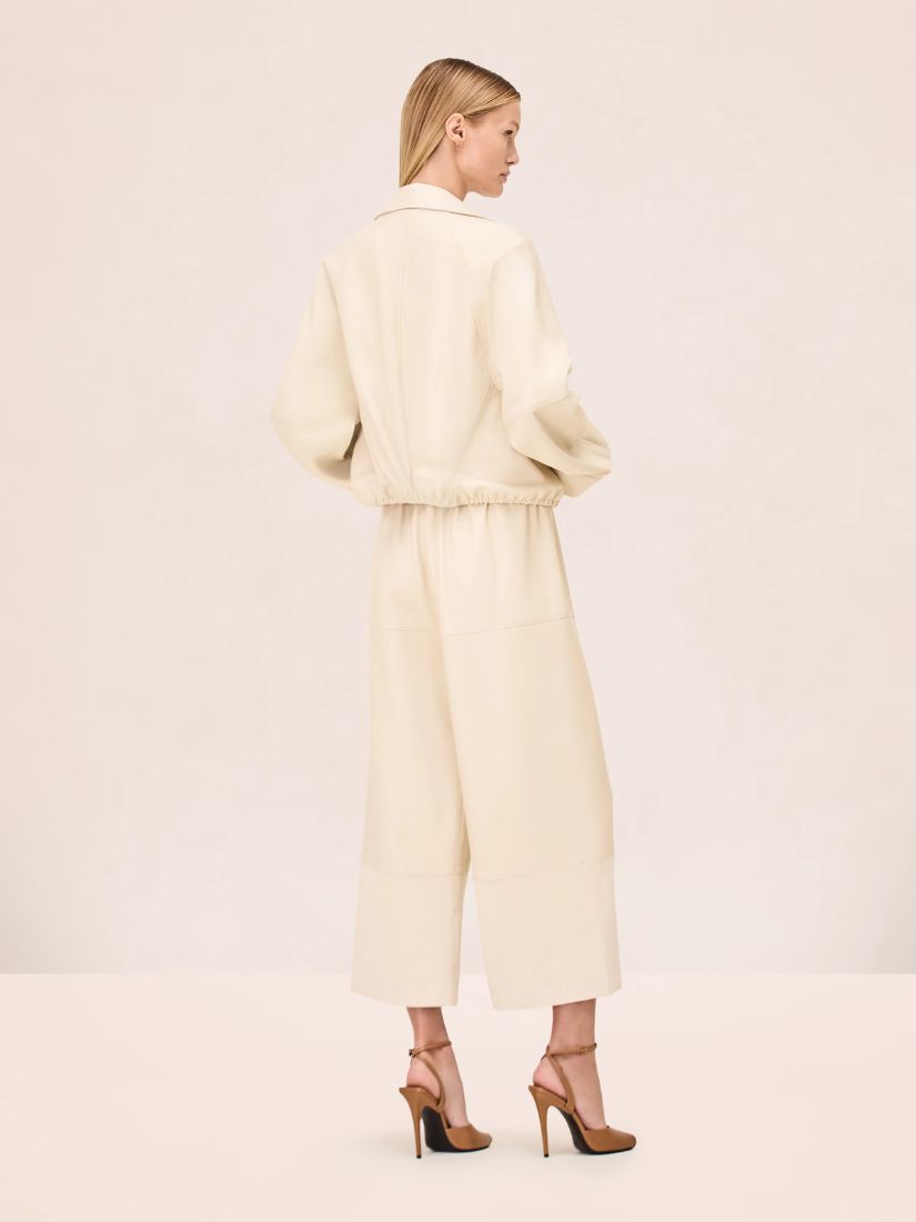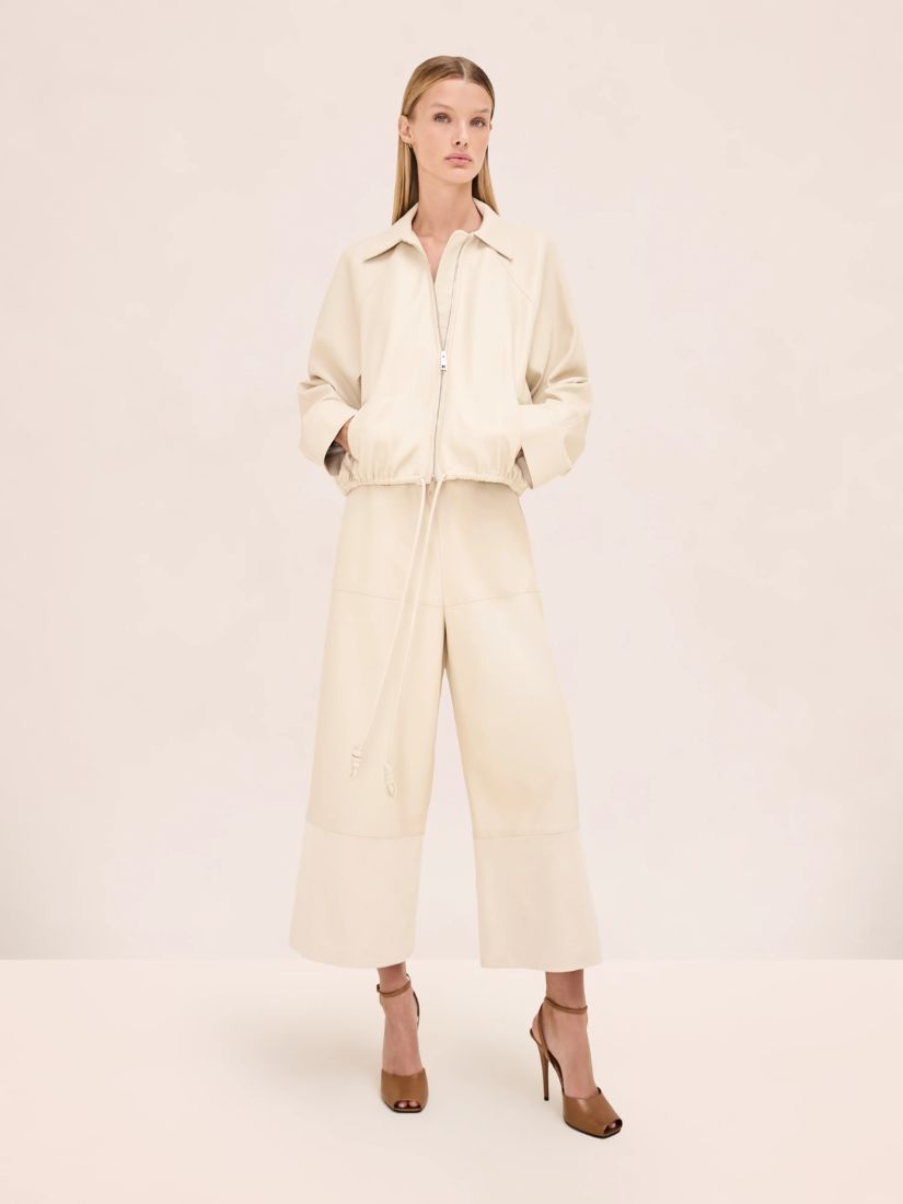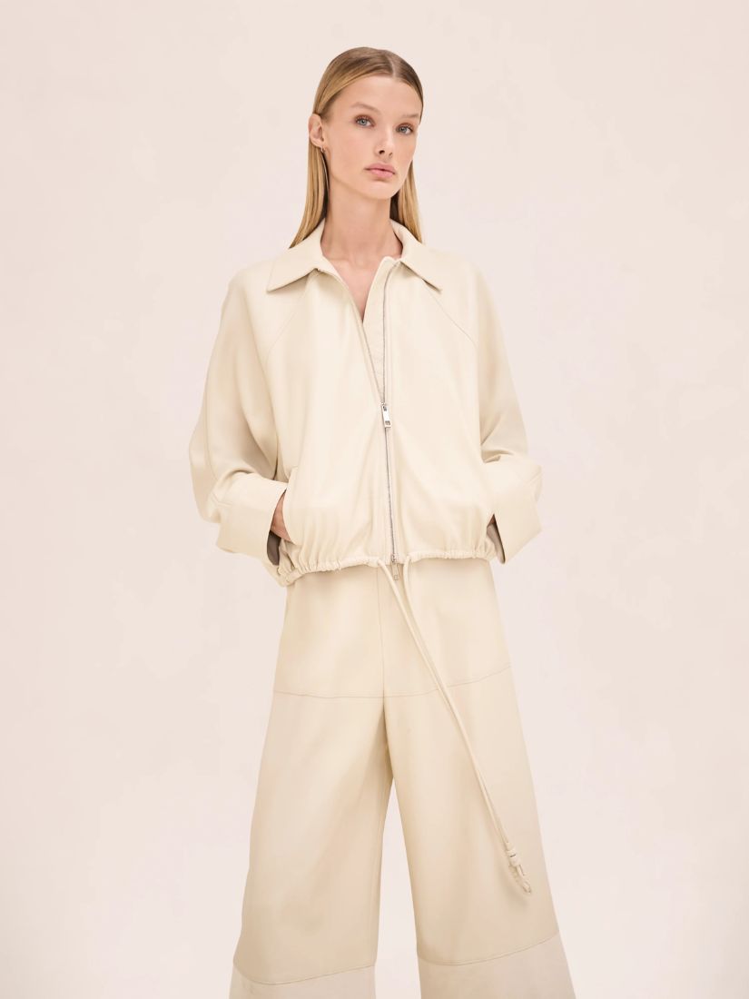 The Channing Jacket is a relaxed zip-front style with a pointed collar, paired with the wide-leg Jacob Pant