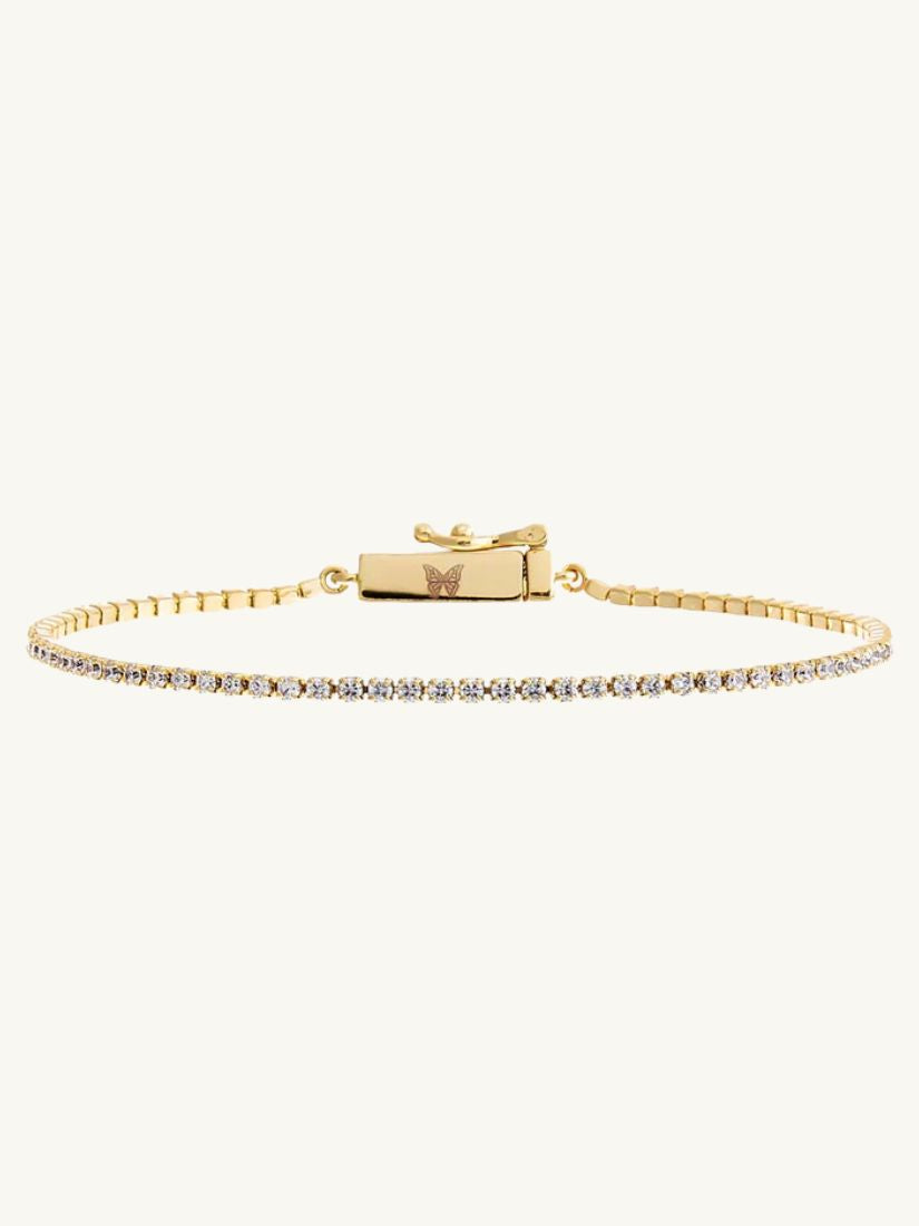 Introducing the Adina Eden Classic Thin Tennis Bracelet, a timeless piece crafted from high-quality brass and plated with luxurious 14K gold. This elegant bracelet is adorned with clear CZ stones, each measuring 1.5MM, creating a refined and sparkling design. With a length of 6.75 inches and a secure box clasp, this bracelet offers both style and comfort, making it an ideal accessory for any occasion.