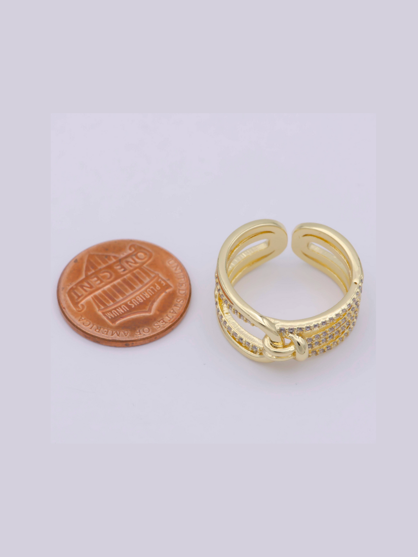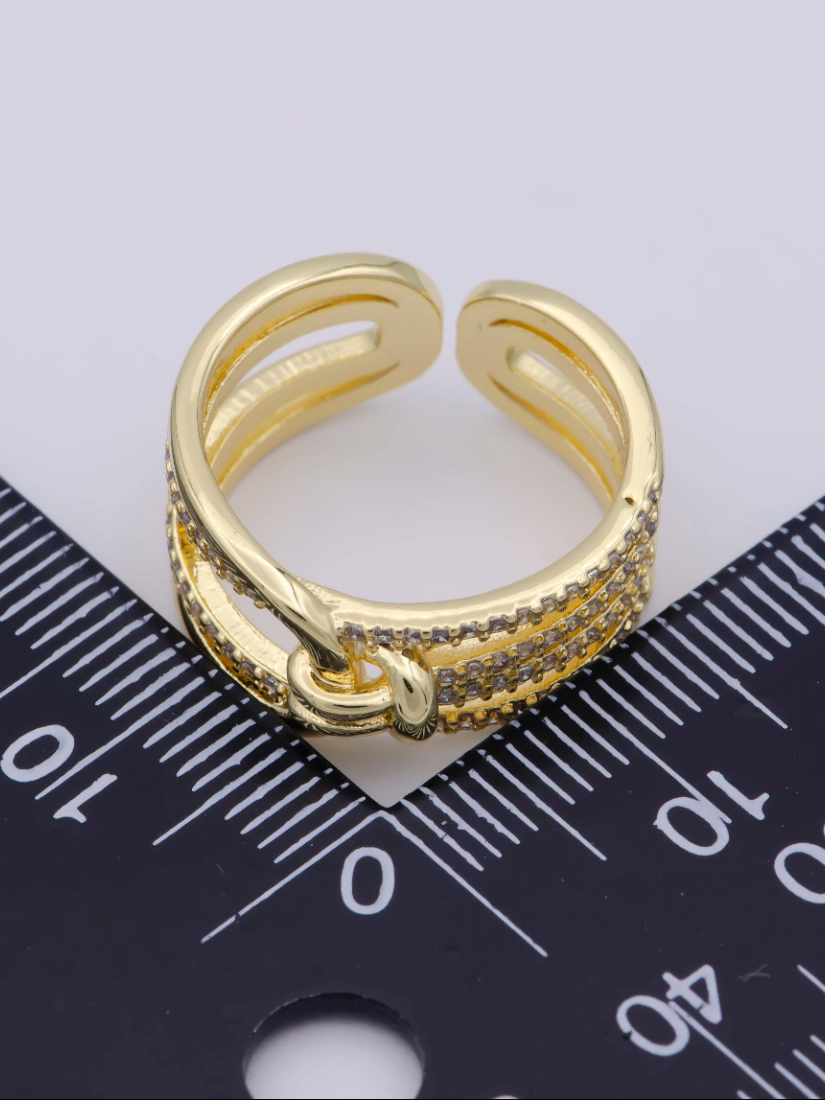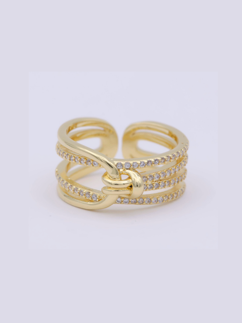 Where elegance meets edge. This open band ring features a bold knot centerpiece symbolizing strength and connection, framed by rows of pavé-set crystals that add a touch of sparkle. Crafted in polished gold, its layered design gives the illusion of stacked bands—all in one standout piece.
