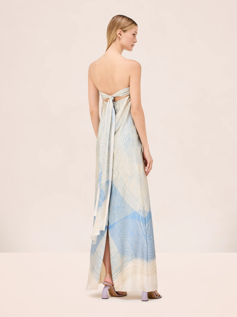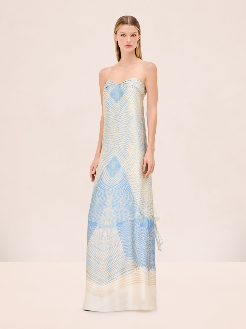 The Dianne Dress is a strapless satin maxi silhouette featuring sculpted bust cups, a mirrored geometric print, and an adjustable back tie.