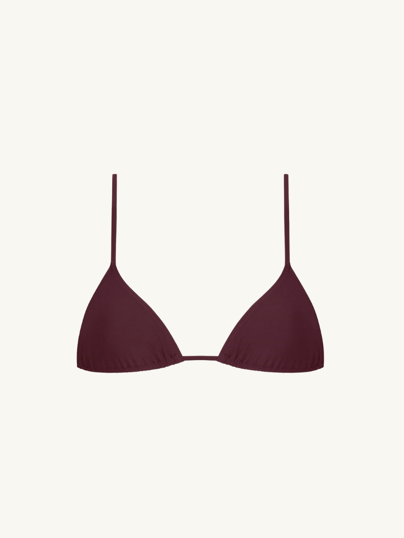 a classic triangle top with string straps that tie at back. the fixed shoulder straps and cups can be adjusted along the drawstring to find your perfect fit, or can be detached and tied at the neck. made in a soft compression fabric in kalamata.