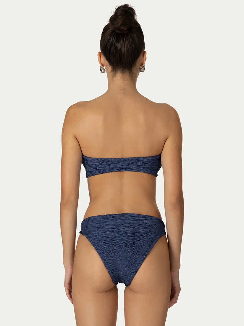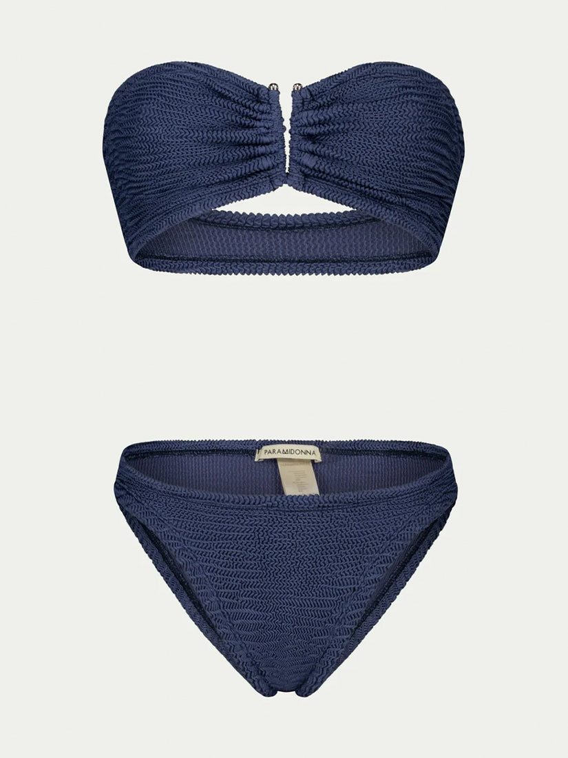 Elegant two-piece swimsuit set in shimmering navy blue lurex fabric for a chic beach look.