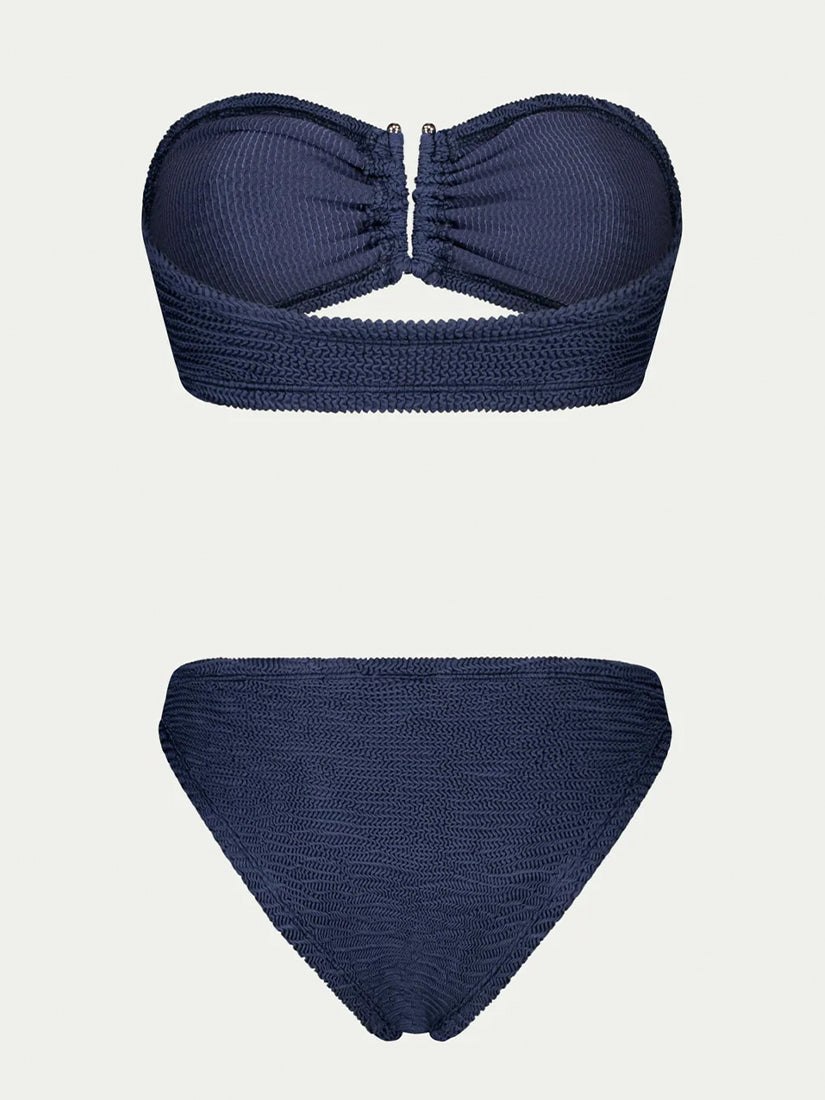 Features a strapless bustier top with a central cut-out and metal accent, paired with a low-waist bikini bottom.
