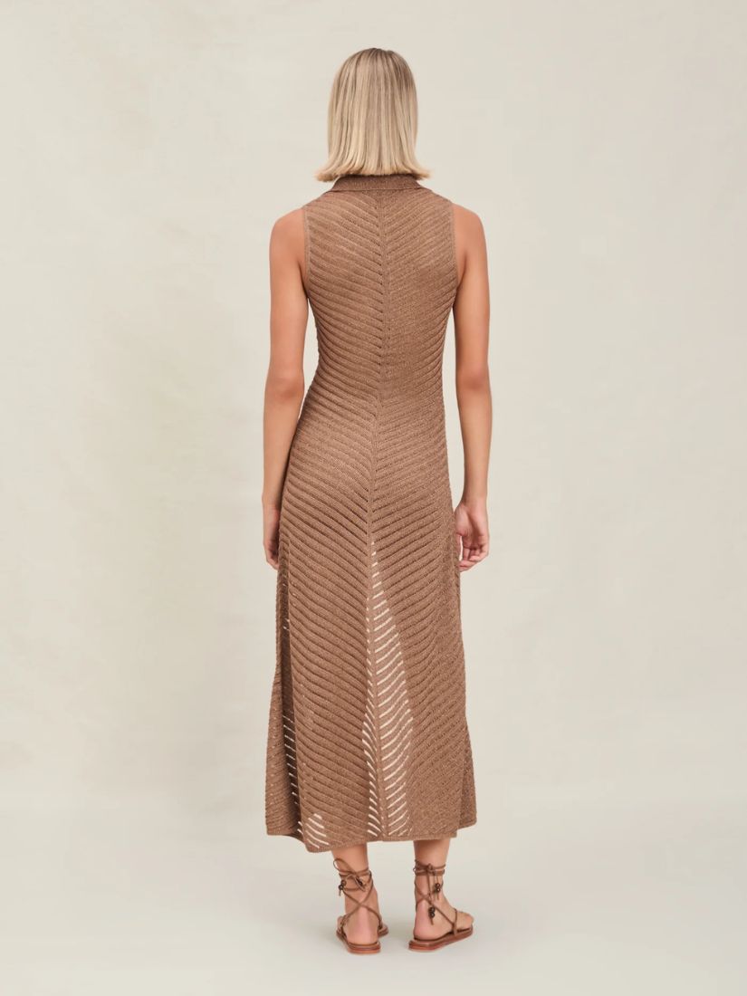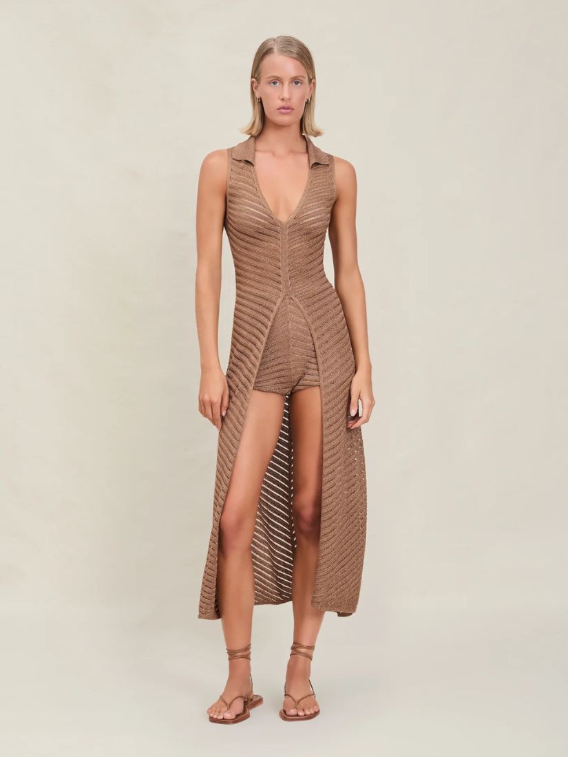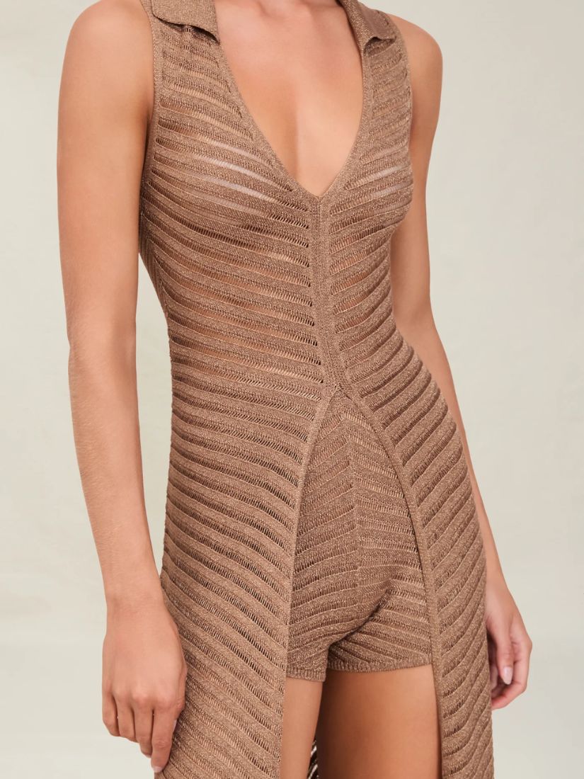 The Gretta is a collared, open front metallic knit robe that pairs back with the Gem Short.