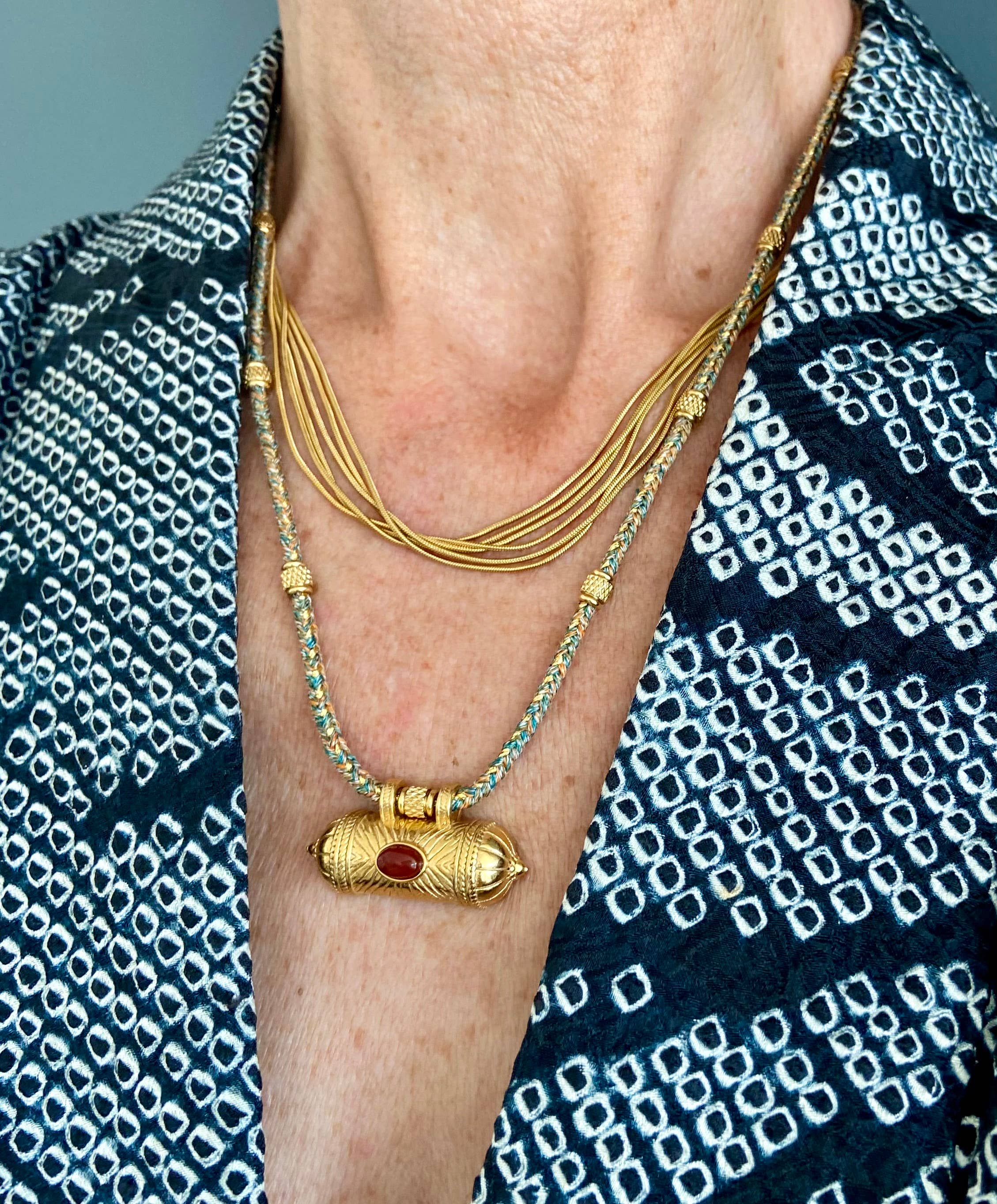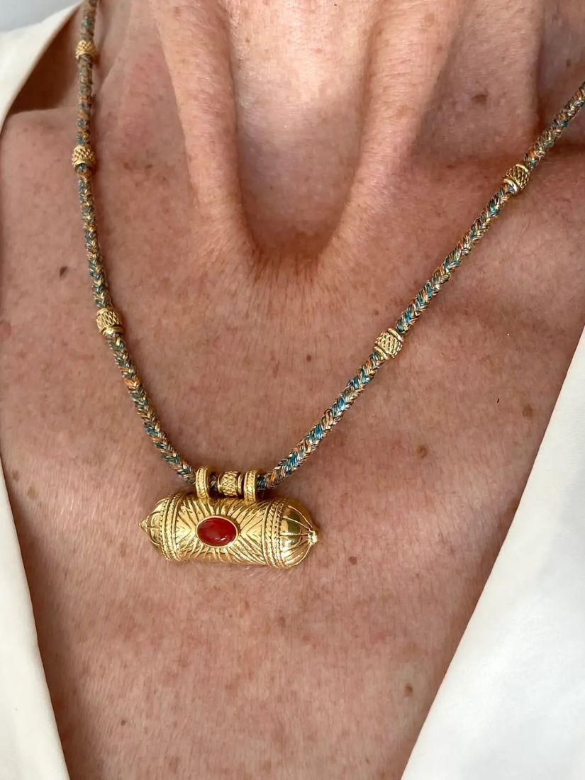 Fall in love with this beautiful talisman necklace featuring an 18-karat gold-plated stainless steel pendant with carnelian stone mounted on a mixed woven cord with the message “Joy” written on the back. This Mantra necklace was created to combine the power of words with the beauty of jewelry. It is the most effective way to carry positive and inspiring words.