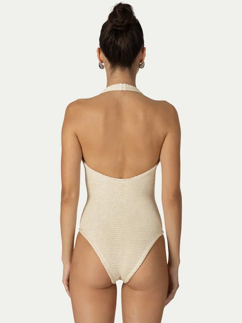 Elegant one-piece swimsuit in ivory designed to flatter all body types.