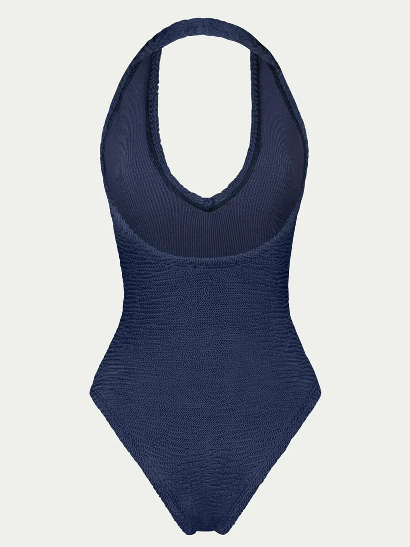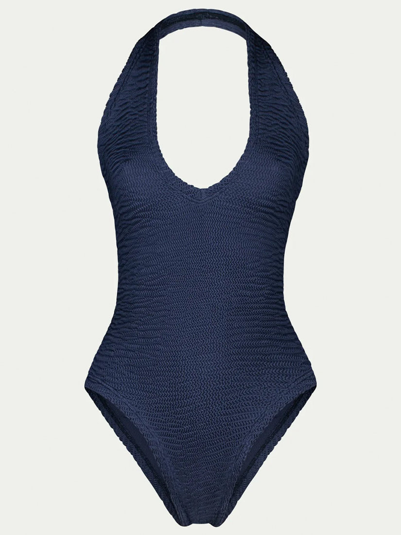 Elegant one-piece swimsuit in shimmering navy lurex for a sophisticated beach look.