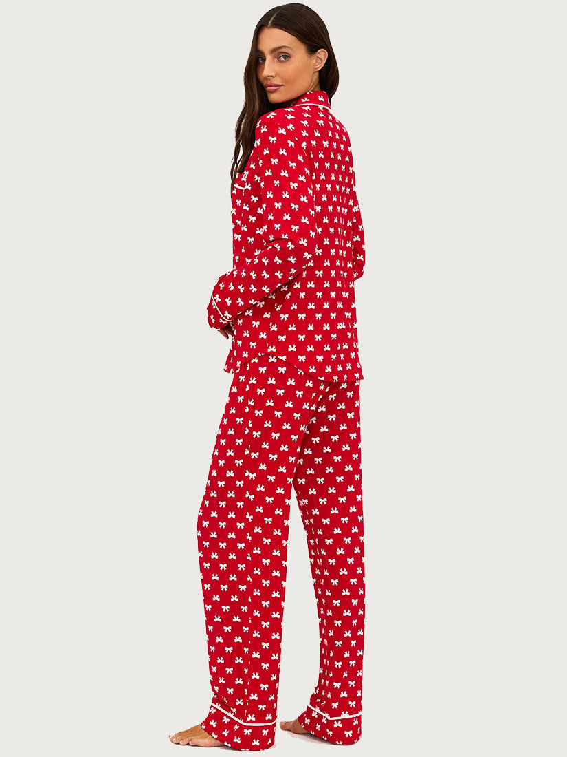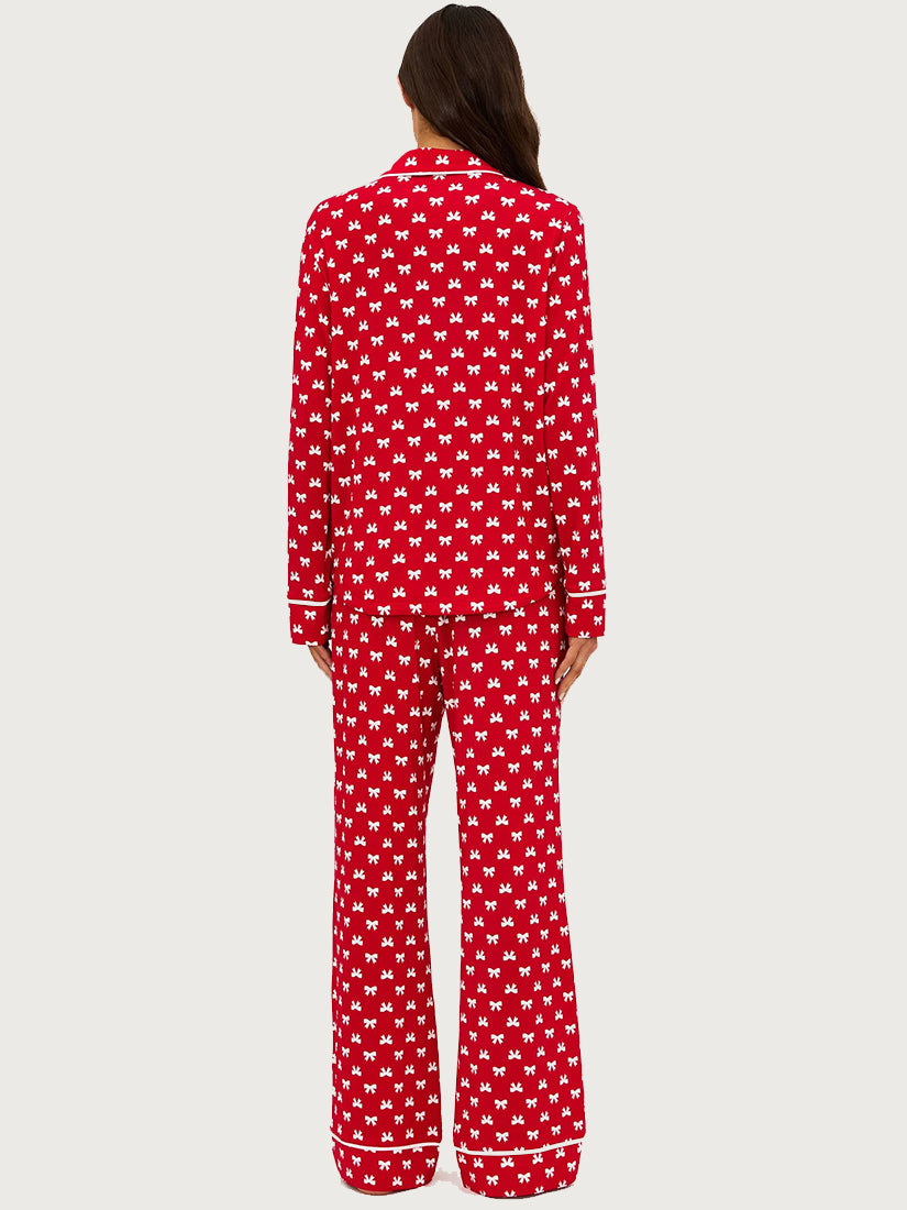 Chic two-piece set featuring the Livy Top and Connie Pant in a playful Peppermint Bows print.