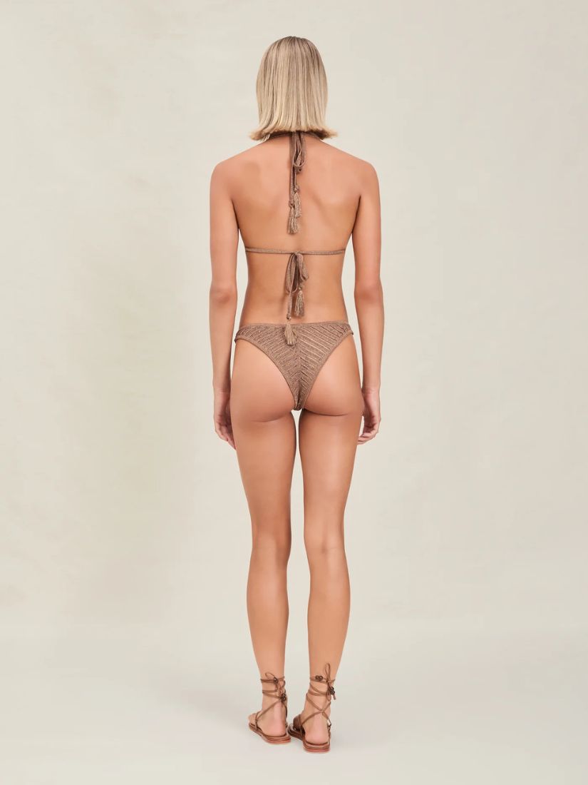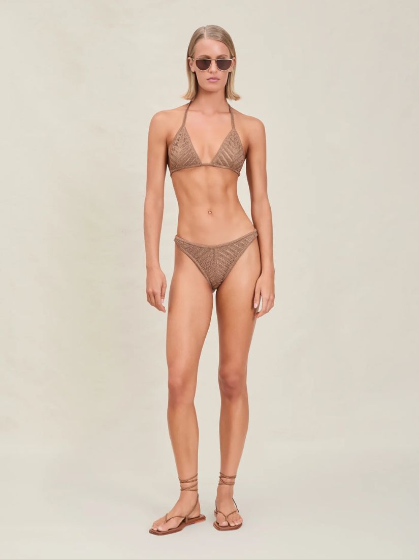 The Lola is a metallic knit bottom with cheeky coverage and lined with swim fabric. Pairs back with the Lucinda Top.