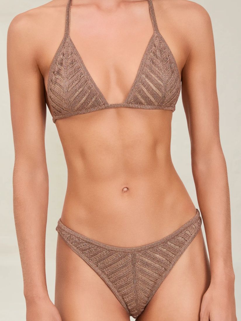 The Lucinda is a metallic, knit triangle top with adjustable neck and back ties. The Lucinda is lined with swim fabric and pairs back with the Lola Bottom.