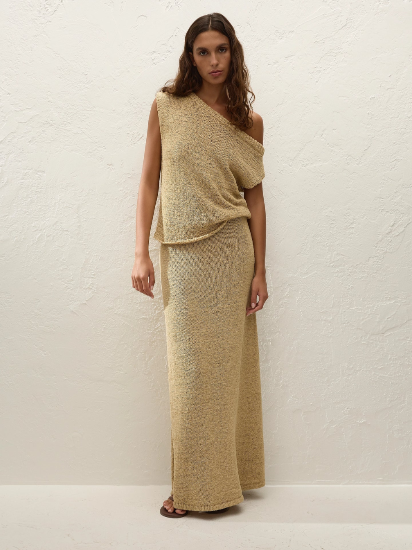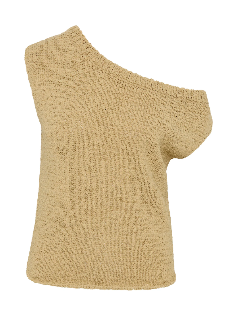 An off-shoulder top, designed from a unique heavy-weight jersey knit, blending cotton and nylon, in a warm neutral. Relaxed in its shape, it is intended to hang effortlessly on the body, with one sleeve dropping low on the arm and a ribbed band around the neckline. Style with the matching Micah Skirt for beach to bar dressing.