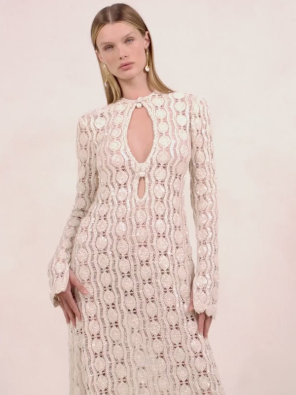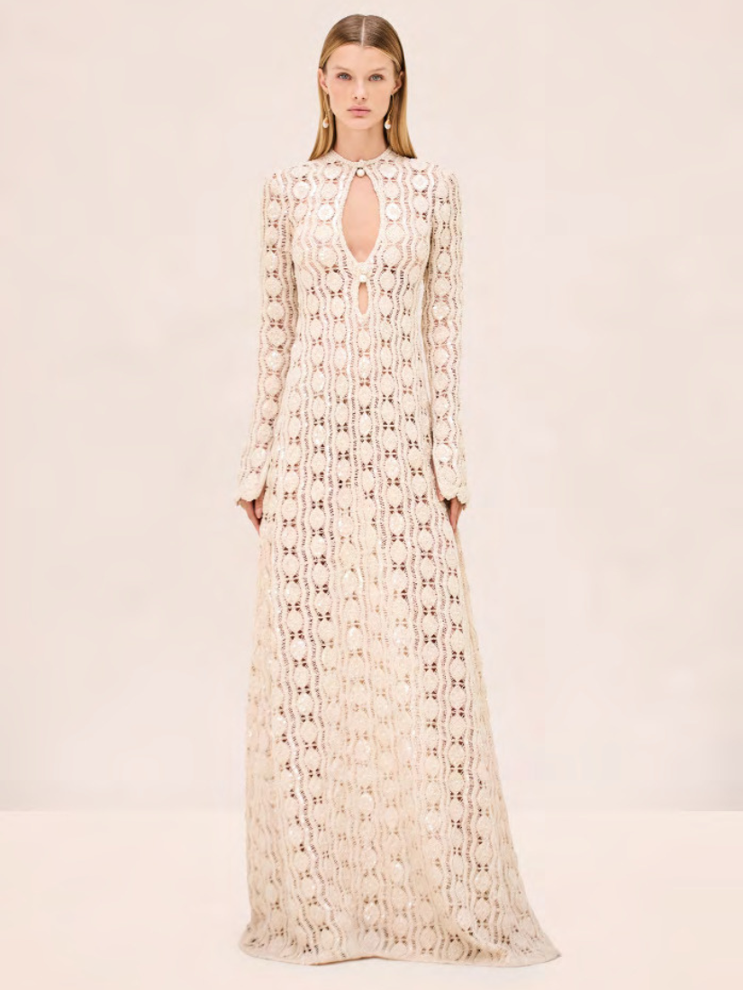 The Niccola Dress is a long-sleeve maxi dress crafted in intricate lace with a front keyhole neckline.