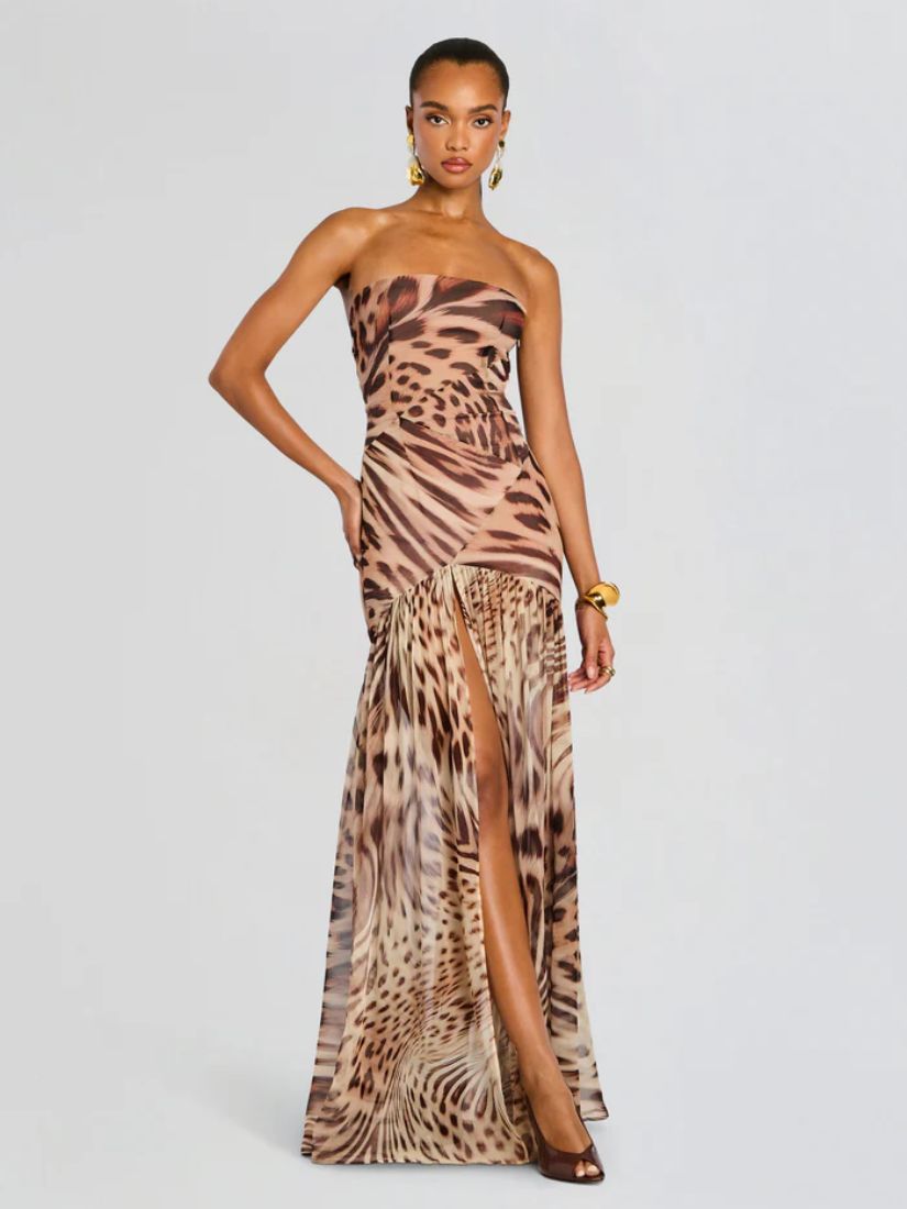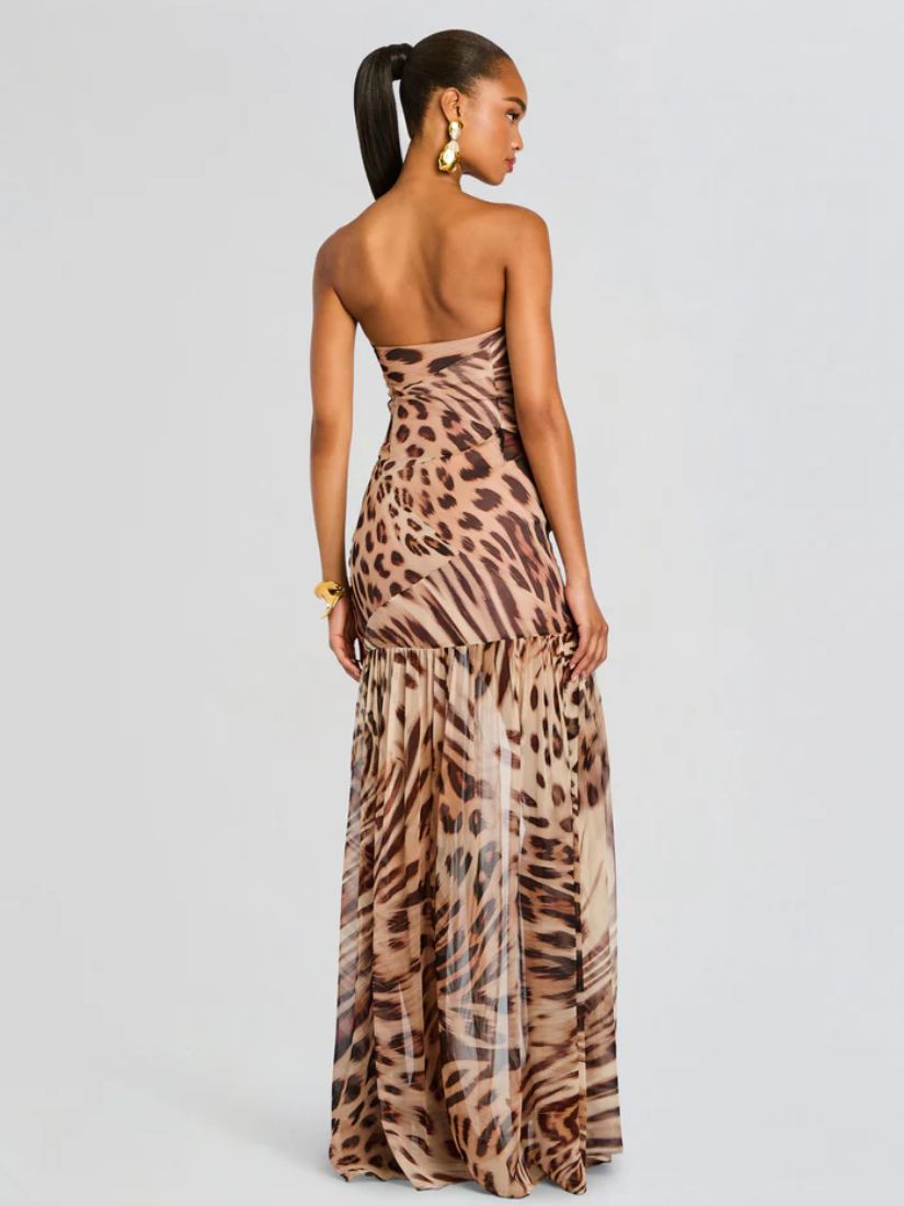 Walk on the wild side with our Nicole Silk Chiffon Dress. This strapless maxi dress features a fierce print with bias-cut, frayed panels throughout the bodice, and a romantic, sheer skirt. A zipper located on the side completes the look. Embrace your adventurous spirit with this captivating dress- crafted to demand attention, this strapless maxi dress boasts a stunning print that exudes fierceness and confidence. Shown here in Animal Print.