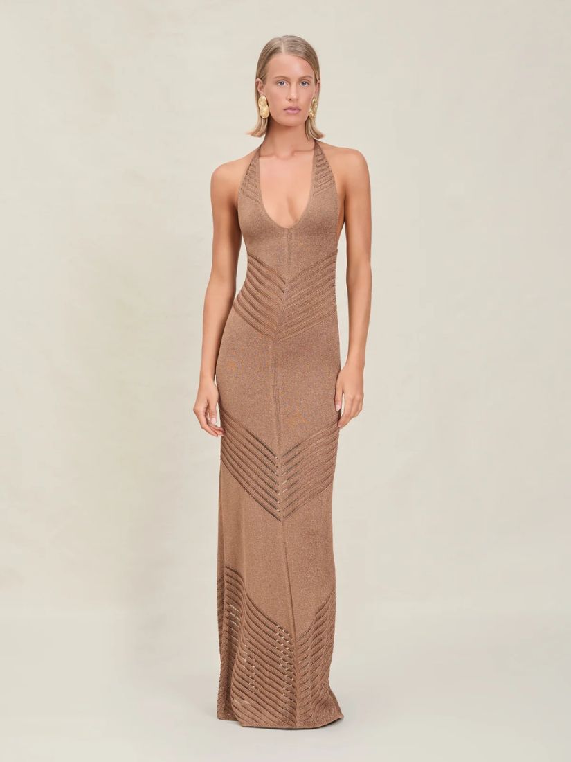 The Roma is a metallic, halter-neck maxi dress with a scoop neckline and adjustable straps at the neck.