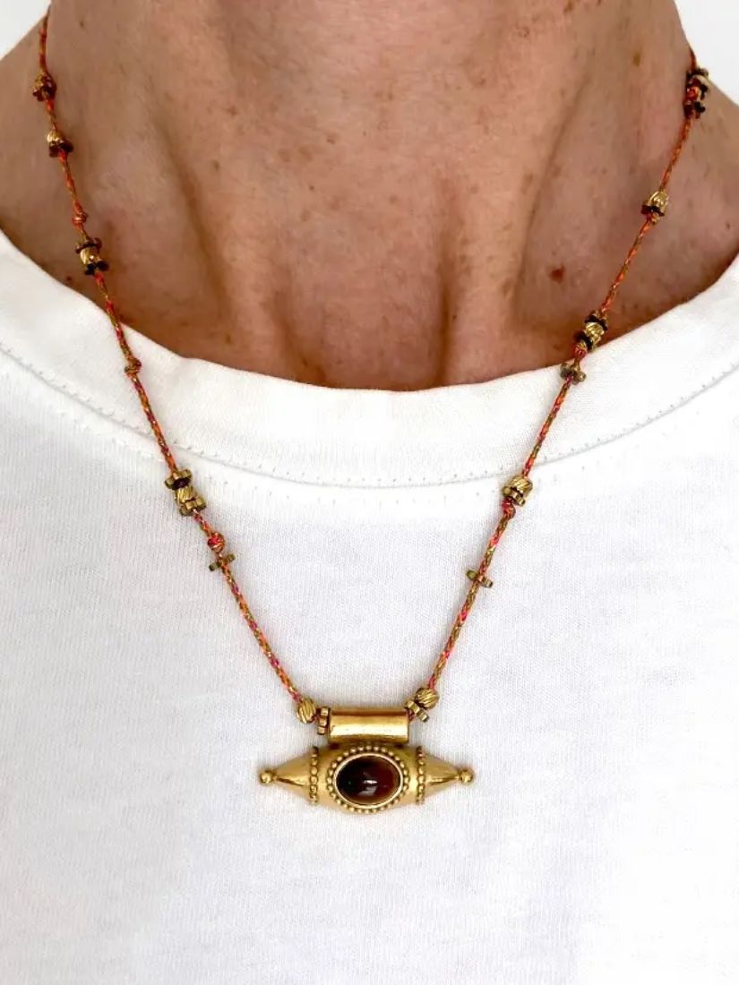 Amulet pendant necklace that will protect you from evil, bad luck or illness. The 18-carat gold-plated stainless steel pendant is set with a tiger's eye stone mounted on a beige and pink intertwined cord. Wear it to remind yourself of your inner strength and resilience.