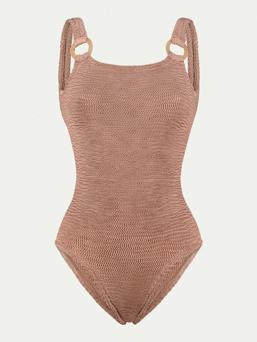 Elegant one-piece swimsuit in rose beige with decorative turquoise strap details.