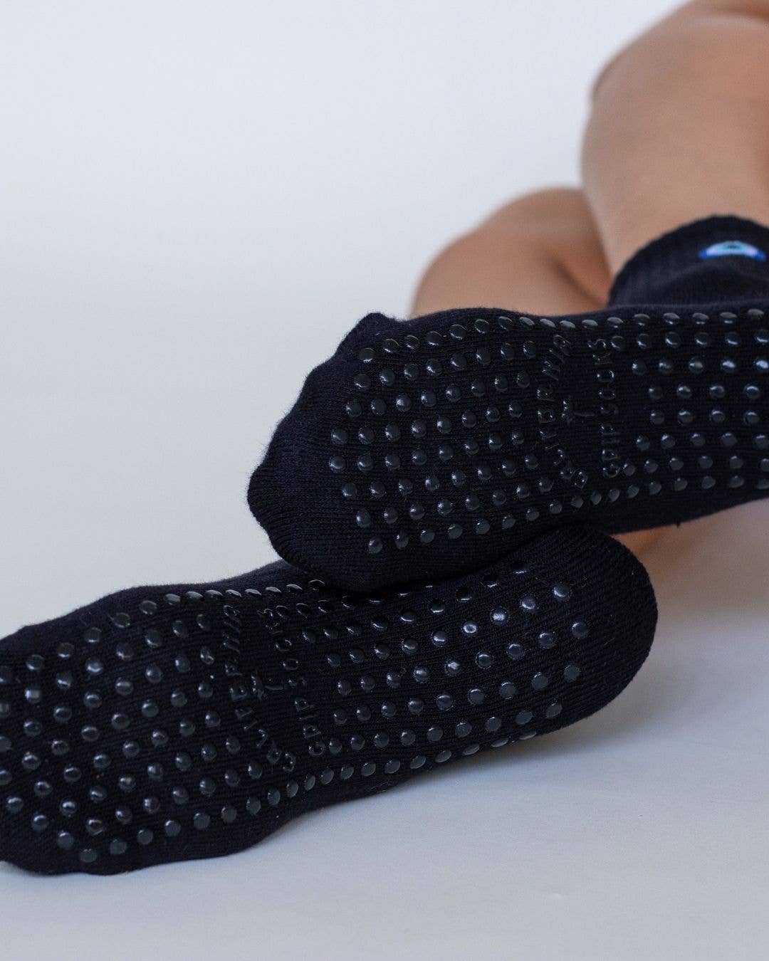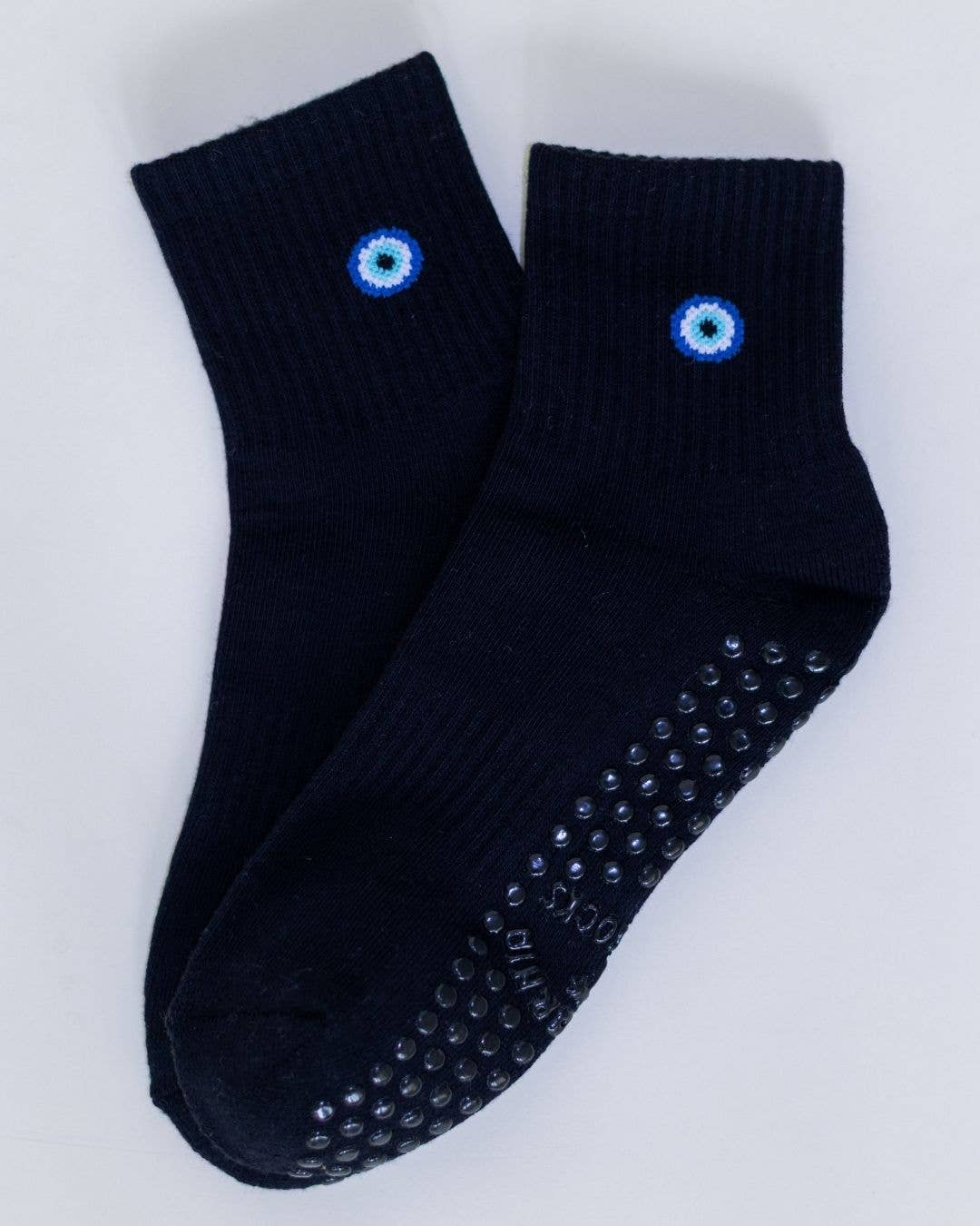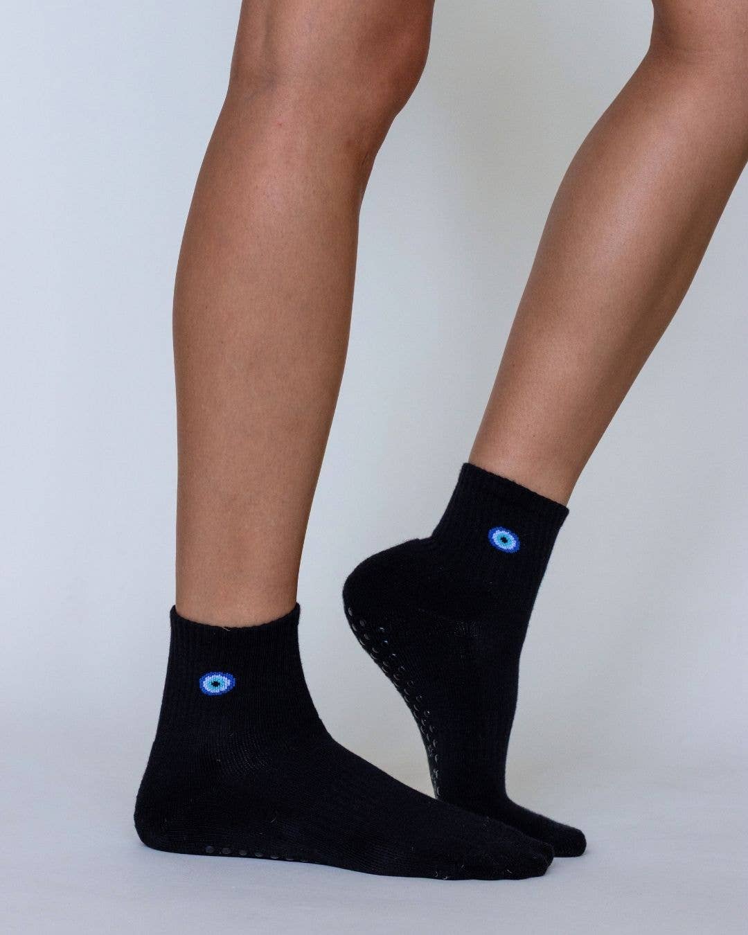 Black grip sock with an evil eye design on the outer AND inner side of each sock. Super sticky matching black grips with logo design.