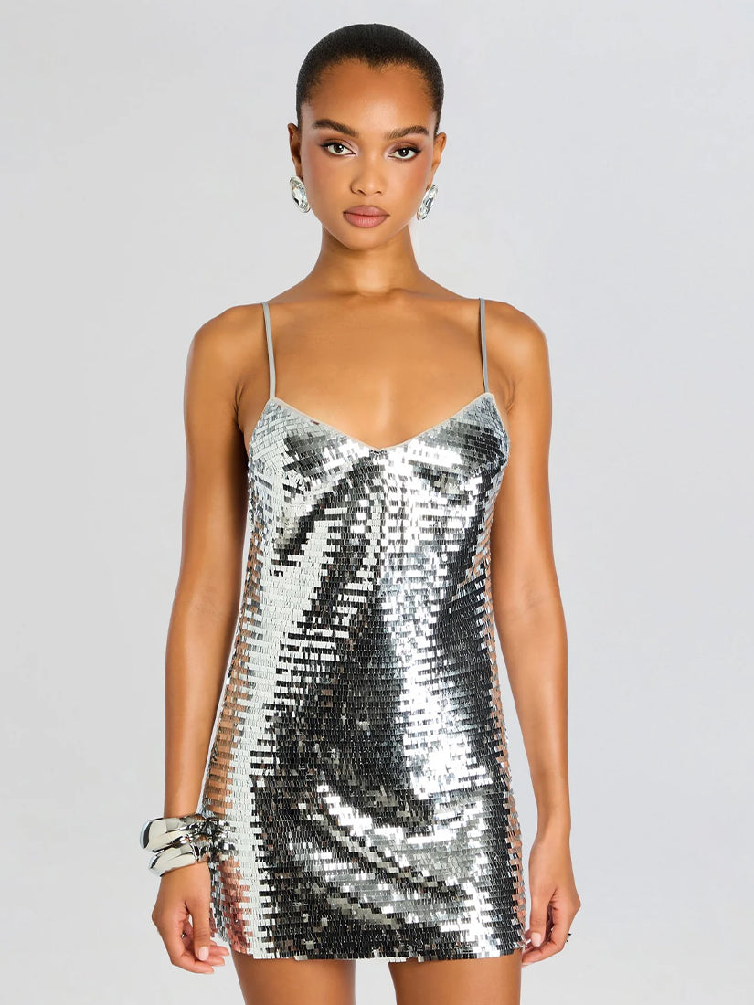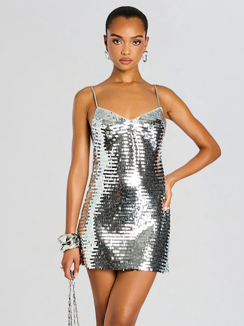 Glamorous silver sequin dress perfect for parties and special occasions.