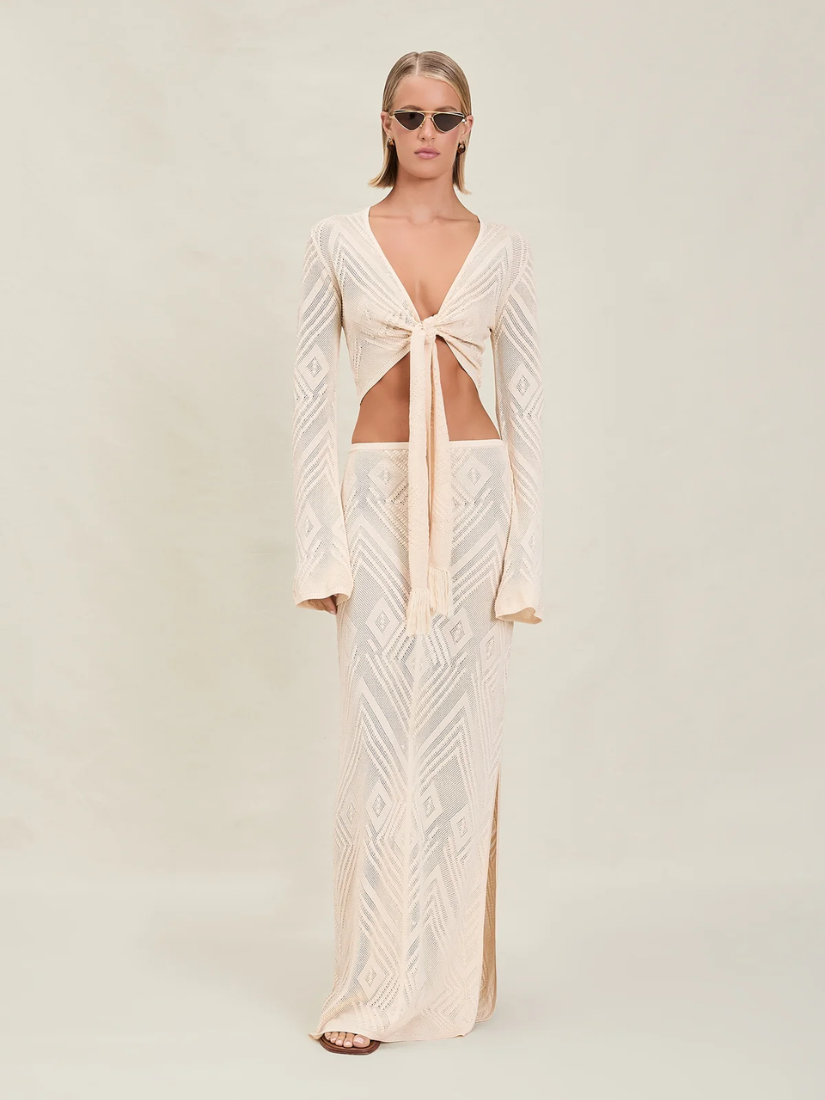 The Vie is a knit maxi skirt with an elastic waistband and side slit. Pairs back with the Vale Top.