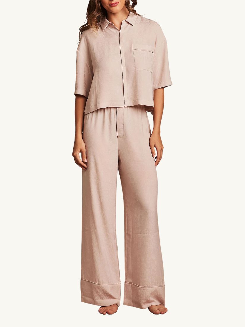 - Features: collar, front patch pocket with self piping, dropped shoulder, cropped length, elbow-length sleeves